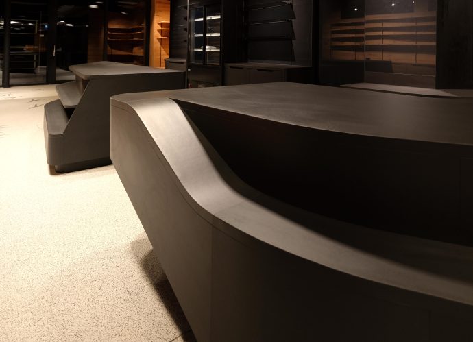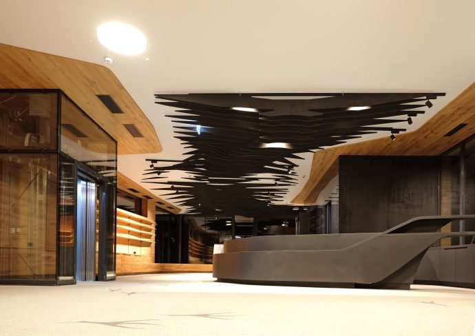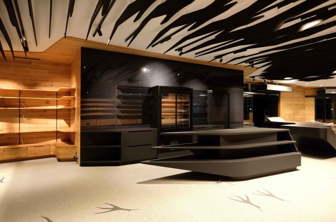 As part of the Söll mountain railway project planned by i-unit architecture, the interior design of the shop inside the gondola station was also designed. In the shop ‘the raven’s nest’, motifs of the raven are used as a design element and implemented parametrically. This can be seen in the furniture, the wall panelling and shelving and the ceiling frames, which materialise the raven’s flight in its sequence.