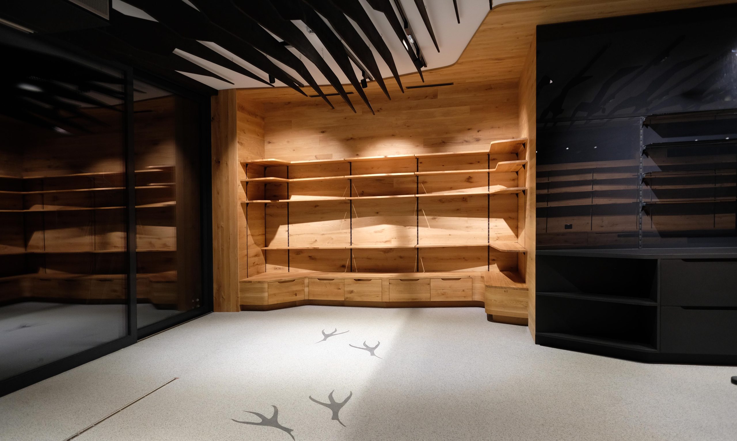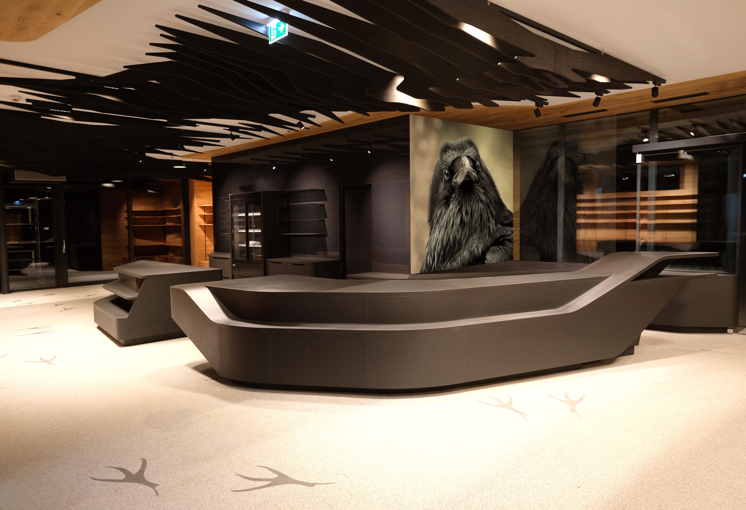 As part of the Söll mountain railway project planned by i-unit architecture, the interior design of the shop inside the gondola station was also designed. In the shop ‘the raven’s nest’, motifs of the raven are used as a design element and implemented parametrically. This can be seen in the furniture, the wall panelling and shelving and the ceiling frames, which materialise the raven’s flight in its sequence.