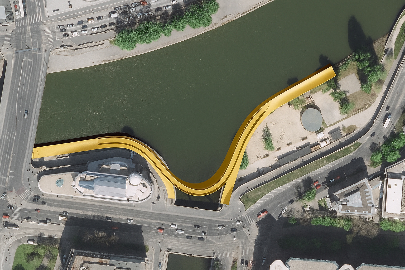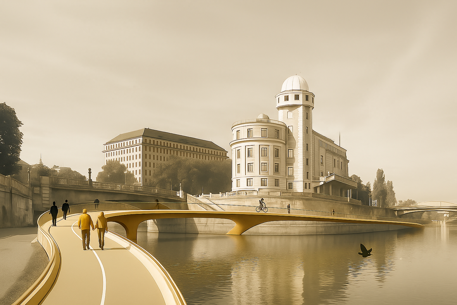 Der „Mündungssteg“ – Sichtbarmachen des ihn umgebenden Raumes: DIE BRÜCKE IM RAUM –GESTALTUNG bewusst erlebt „Unten am Kanal gehen oder radeln wir vom Schwedenplatz Richtung Urania: Der Weg ist eben, beschaulich, breit, rechts die Mauer, der Kanal links, ein Geländer wird nicht vermisst; sobald der Blick auf die Urania fällt, treten Rampen ins Blickfeld, Geländer, Treppen … Dieser Weg, der nach der Urania abrupt in einer Krümmung enden muss: der Wienfluss; liegt vor uns – - bisher und dann?! ein Fußgänger- und Fahrradsteg kann alle diese Linien auffangen und verstärken- in einem nach oben und in die Wienufer führenden Bogen führt er ruhig weiter; zeigt auf neue Art dieses schon bestehende Biegen des Ufers; gibt den Blick frei auf wendende Schiffe, auf einen interessanten View der Radetzky- und Bahnbrücke; führt dann wieder hinab – – zu neuen lebenssprühenden Ufern (Sommer! und Sandstrand) – ohne mehrfach zeitlichem Interruptus einer aufgeklappten Variante - Herbst!: setzt diese, an einem Abend völlig im Dunkeln schlafende Ecke auf beiden Ufern der Flussmündung neu in Szene durch schlanke Lichtlinien, gezielte und permanente Beleuchtung. Die „fließende“ Konstruktion des Steges nimmt sich zurück, schlank und fast unsichtbar, um gleichzeitig damit zu zeigen, was erst heute technisch machbar ist; nichts stört die Ruhe der Bewegung. Die „Haut“ des Steges schimmert wie ein Fisch unter Wasser und gibt sanfte Lichtspiegelungen. Gleichzeitig erinnert beim Daraufzugehen die Unterseite an einen Bootsrumpf in dem man geborgen das andere Ufer erreicht. Bewusst ist hier keine ähnliche oder aufwändige Konstruktion vor der Radetzkybrücke, die sonst – bis auf das unerwünschte! Aufklappen – vor der Brücke steht. Das Geländer transparent- ein Handlauf der den Brückenbogen filigran für den Fußgänger spiegelt. Die Konstruktion der Brücke am Ufer verschmilzt nicht mit der Ufermauer zu einem „Betonsockel“ sondern steht eigenständig, selbstbewusst mehrfach auf schlanken, teils schrägen Stützen verschiedener Stärken, wie erforderlich, und lässt die Ufermauer weiterlaufen. Die Stützen setzen sich vom schimmernden Brückenkörper ab- matt und in verschiedenen Erd- und Pflanzenfarben „wachsen“ sie in eigener Position. Die schlanke(!)Mittelstütze (1!) – der sensible Teil vor der Radetzkybrücke deckt nicht einmal bei Frontalansicht den Sockel ab. Die Stütze teilt ihn in 2 Teile ( eine frontale Moment(!)aufnahme) und verzweigt sich oben, um wieder Durchblicke zu focussieren.. Beim Vorbeifahren mit dem Schiff oder Wandern über den Steg wird die Situation jeweils neu erlebt. Ines Bösch |