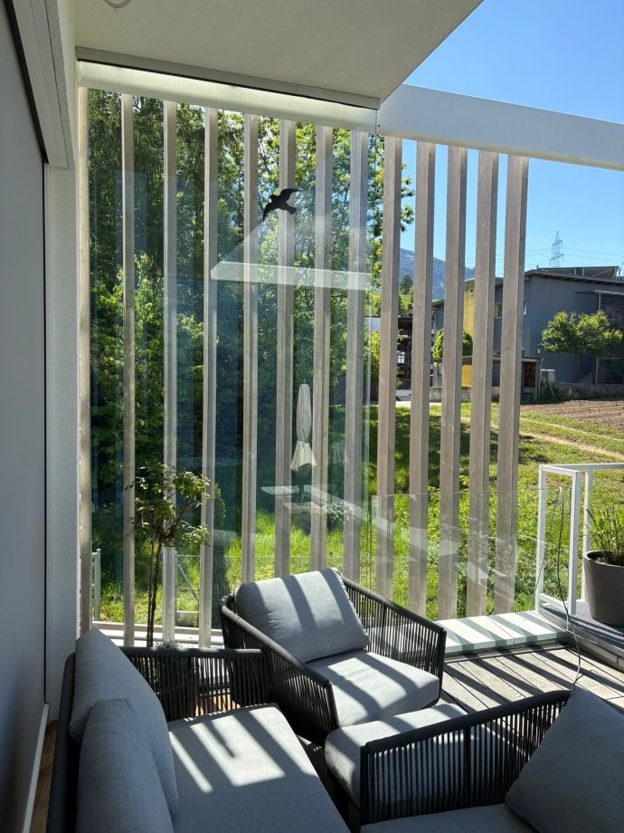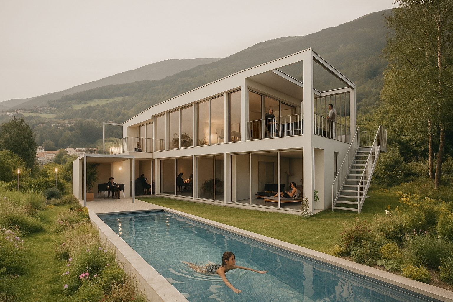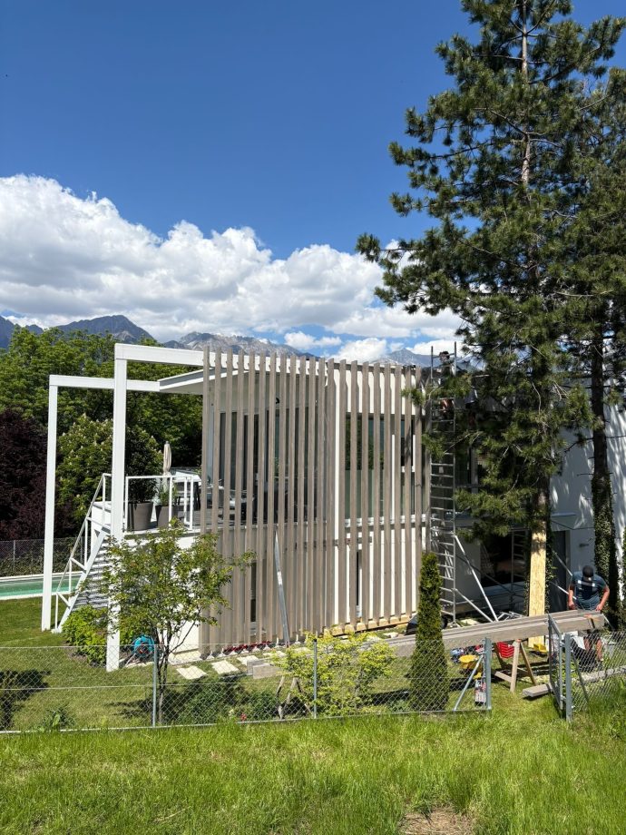 Villa im Mittelgebirge, Inntal, Tirol Vormals als Doppelhaus geplant, haben die neuen Eigentümer eine Situation vorgefunden, mit einer schwierigen Erschließung über zwei Untergeschosse, dafür dann eine erhöhte Positionierung des Erdgeschosses an einer Geländekante mit 270° Blick über das Inntal mit der Nordkette als Panorama. Das hat die Bauherren dazu bewogen, das Erdgeschoss und das Obergeschoss dreiseitig zu verglasen und den viergeschossigen, nach Osten gerichteten Teil, als Turm auszubilden. Mittels eines Aufzuges und einer Außentreppe gelangt man von der Parkebene in die oberen Geschosse. Intern wird das Gebäude über eine Stahltreppe mit Eichenstufen vom 1. UG bis ins OG erschlossen. Ganz in der Manier des „international style“ wie ihn Neutra, Johnson und Breuer geprägt haben, lößt sich das Gebäude von Ost nach West in einem Staccato von vertikalen Lamellen auf und wird über „spiderlegs“ in den Außenraum verlängert. Die Spiderlegs rahmen wiederum besondere Ausschnitte der Landschaft und bilden gleichzeitig geschützte Terrassen aus. Nordwestlich bildet ein schlanker Pool eine Projektionsfläche und spiegelt den Ausblick auf die Nordkette zweifach in den Wohnraum. Das anschließende Poolhaus bildet einen kleinen Trabanten des Haupthauses mit Spiderlegs Richtung Pool zur Beschattung und Lamellen nach Norden als Sichtschutz zu den Nachbarn. Das Obergeschoss ist ein „Einraum“ in dem das Wohnen zelebriert wird. Das Erdgeschoss ist zweigeteilt in „Masterbedroom“ mit Schrankraum, Bad und Sauna und einem Gäste-/ Arbeitsbereich im östlichen Turm. Im ersten Untergeschoss befindet sich ein weiteres Gästezimmer, der Weinkeller und ein großzügiger Gardarobenbereich. Im Süden wurden zwei Kiefern erhalten, die einen wesentlichen landschaftlichen Bestandteil bilden und über die offene Treppe und die zweigeschossige Verglasung innenräumlich wirksam werden. Innen- und Außenraum verschmelzen, Grenzen verschwimmen, was der Absicht des international style weitgehend innewohnt. VM